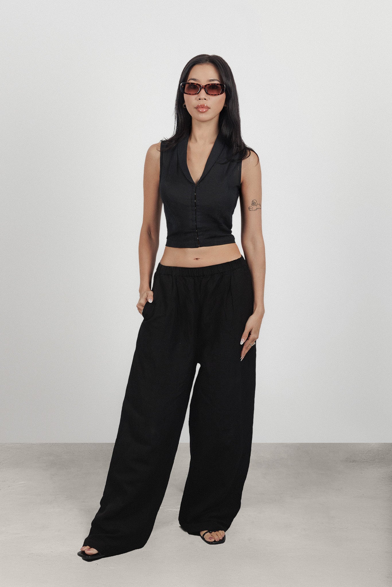 This garment is engineered with a high-tension hip and waist ratio. There is no stretch in the fabric. If you prefer a more relaxed drape through the lower body or fall between sizes, we strongly recommend sizing up to ensure the intended silhouette.