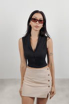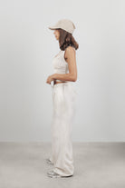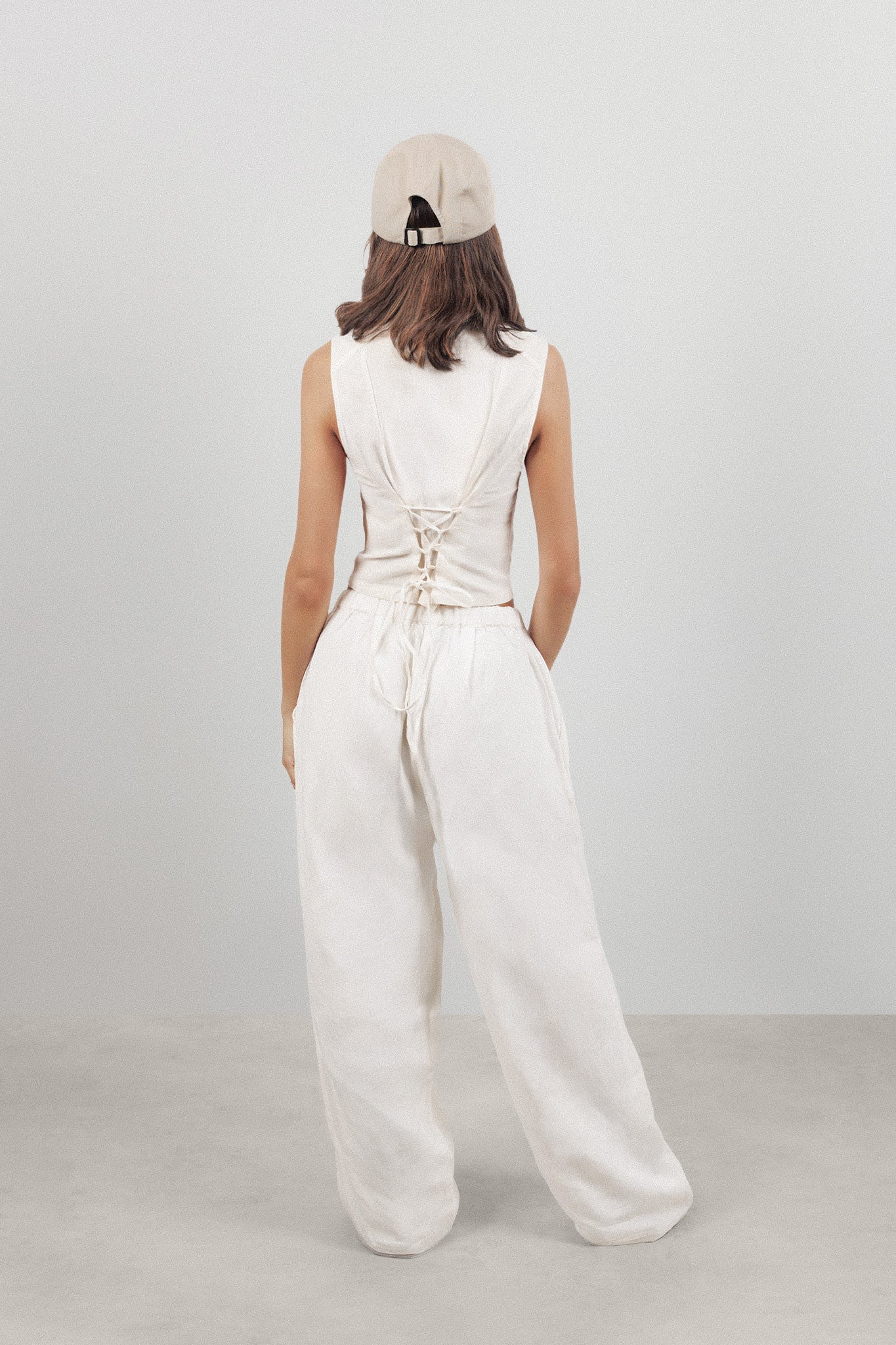 DetailCropped silhouette. Custom-milled cotton-linen blend with natural breathability and a structural weight. Narrow plunge neckline with vertical paneling for integrated contouring. Multi hook-and-eye front closures and adjustable back criss-cross ties allow for a convertible fit from tailored to relaxed.