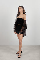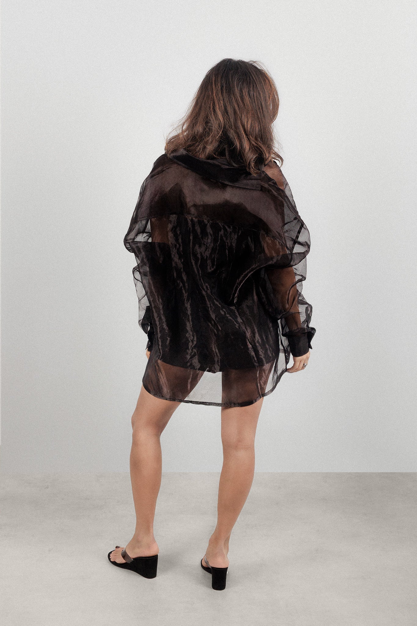 DetailSheer black silk custom-blended with iridescent silver threading. An iteration of the signature oversized silhouette with a dimensional shimmer. Lightweight, breathable drape with an intentional longline length and sleeves designed with exaggerated length.